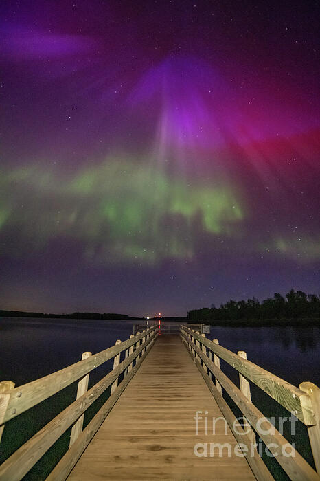 A wooden dock extends out into a calm lake under a vibrant night sky, where colorful auroras light up the horizon. The green, purple, and red hues of... more